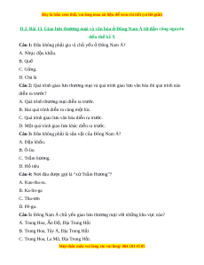Câu 5: Đông Nam Á ch y ủ u ế giao l u t ư hư ng m ơ i ạ v i ớ nh ng khu v ữ c nào? ự A. Trung Hoa, n Đ Ấ , Đ ộ ịa Trung H i ả B. Trung Hoa, Tây Á, Đ a ị Trung H i ả C. Trung Hoa, La Mã, Đ a ị Trung H i ả . M i ọ thắc m c