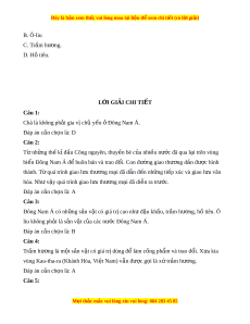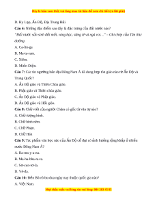 Đây là bản xem th , vu ử i lòng mua tài li u ệ đ xe ể m chi ti t (c ế ó l i ờ gi i ả ) B. In-đô-nê-xi-a. C. Thái Lan. D. Cam-pu-chia. Câu 11: Nghệ thu t ậ ki n ế trúc và điêu kh c c ắ a ủ các qu c gi ố a phong ki n Đ ế ông Nam Á chịu nh ả hư ng đ ở m ậ nét c a t ủ ôn giáo nào? A. n Đ Ấ ộ giáo, Ph t ậ giáo. B. Ph t ậ giáo, Thiên Chúa giáo C. n Đ Ấ gi ộ áo, Thiên Chúa giáo. D. Thiên Chúa giáo, n Đ Ấ gi ộ áo, Ph t ậ giáo. Câu 12: Ý nào dư i ớ đây không ph i ả nh n đ ậ nh đúng v ị văn ề hóa Đông Nam Á? A. Các tín ngư ng b ỡ n ả đ a đã dung h ị p v ợ i ớ tôn giáo t bên ừ ngoài du nh p vào khu v ậ c ự nh ư n Ấ Đ gi ộ áo, Ph t ậ giáo. B. Các c dân Đ ư ông Nam Á không có ch vi ữ t ế riêng mà s d ử ng ch ụ ữ vi t ế c a ng ủ ư i ờ n Đ Ấ , ộ ngư i ờ Trung Qu c. ố C. Văn h c ọ n Ấ Đ ộ nh h ả ư ng ở r t ấ m nh m ạ đ ẽ n văn ế h c các n ọ ư c Đ ớ ông Nam Á. D. Ki n t ế rúc đ n- ề núi là ki u ki ể n t ế rúc n Đ Ấ gi ộ áo tiêu bi u ể Đ ở ông Nam Á Câu 13: Ngư i ờ Vi t ệ k t ế h a h ừ t ệ h ng ch ố gì ữ ? A. Chữ Hán. B. Ch ữ Ai C p. ậ C. Ch L ữ a Mã. D. Chữ Hy L p ạ