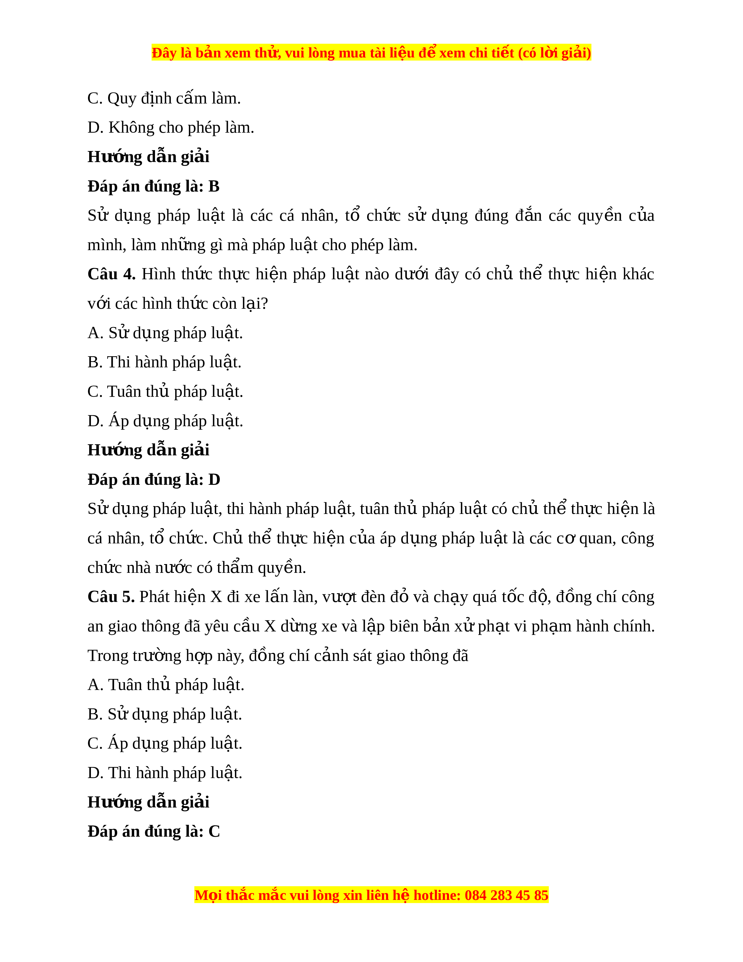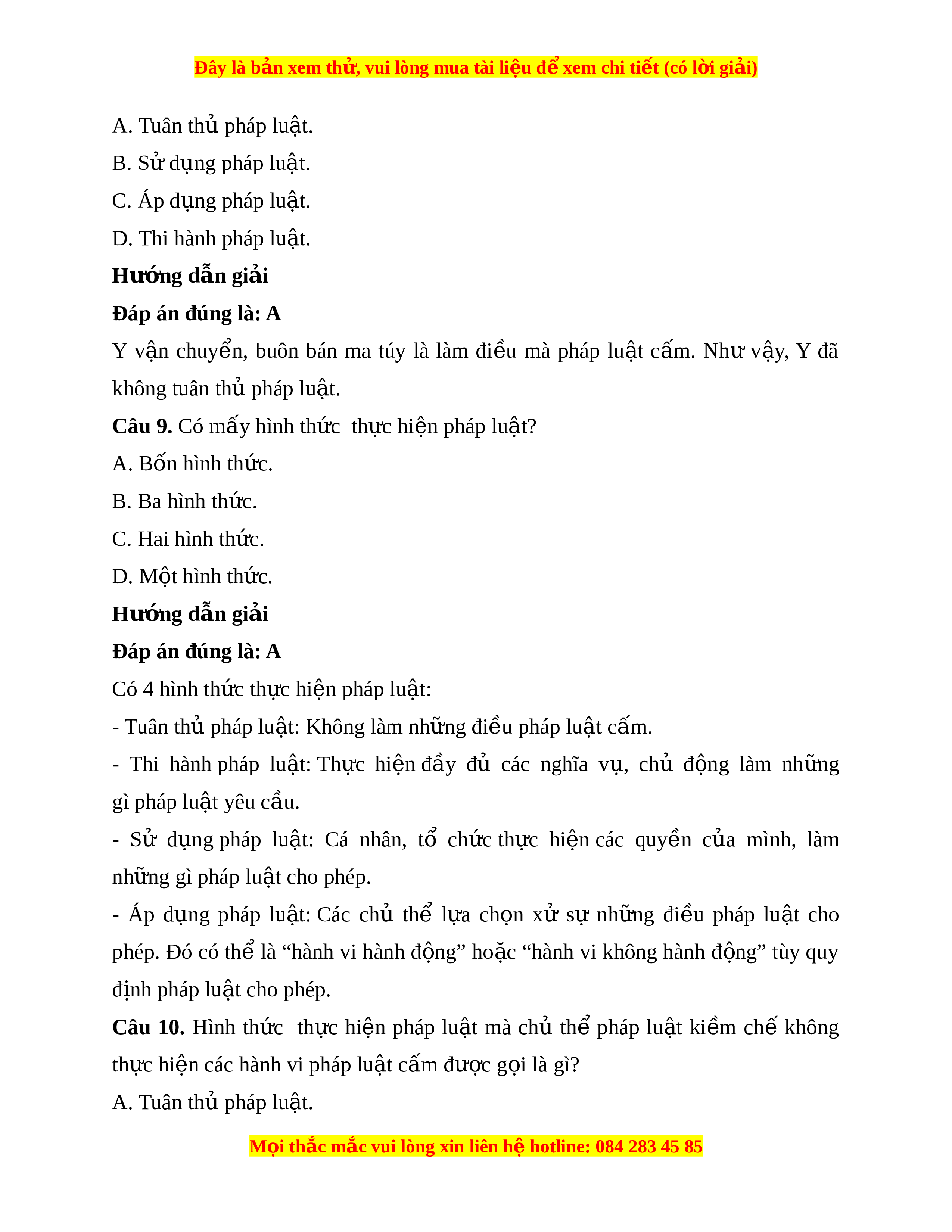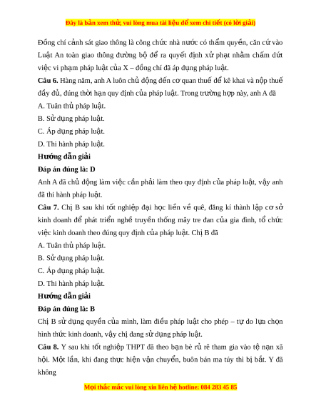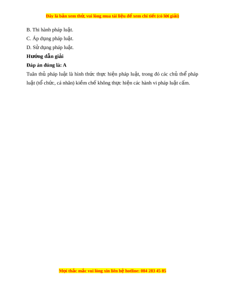 Đây là bản xem th , vu ử i lòng mua tài li u ệ đ xe ể m chi ti t (c ế ó l i ờ gi i ả ) A. Tuân th pháp l ủ u t ậ . B. S d ử ng pháp l ụ u t ậ . C. Áp d ng pháp l ụ u t ậ . D. Thi hành pháp lu t ậ . Hư ng d ớ ẫn gi i ả Đáp án đúng là: A Y v n ậ chuy n,