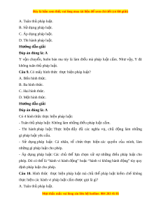Câu 9. Có mấy hình th c ứ th c ự hi n pháp l ệ u t ậ ? A. Bốn hình th c. ứ B. Ba hình th c. ứ C. Hai hình th c. ứ D. M t ộ hình th c. ứ Hư ng d ớ ẫn gi i ả Đáp án đúng là: A Có 4 hình th c t ứ h c hi ự n pháp l ệ u t ậ : - Tuân thủ pháp lu t ậ : Không làm nh ng đi ữ u ề pháp lu t ậ cấm. - Thi hành pháp lu t ậ : Th c ự hi n