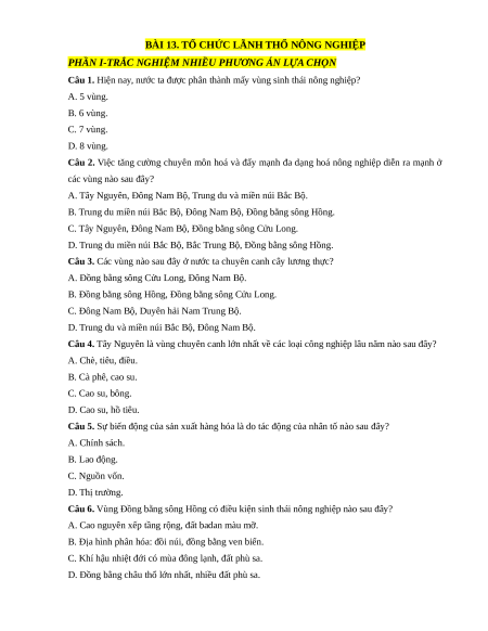 Câu 1. Hiện nay, nước ta được phân thành mấy vùng sinh thái nông nghiệp? A. 5 vùng. B. 6 vùng. C. 7 vùng. D. 8 vùng.