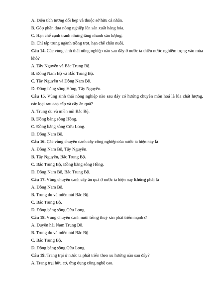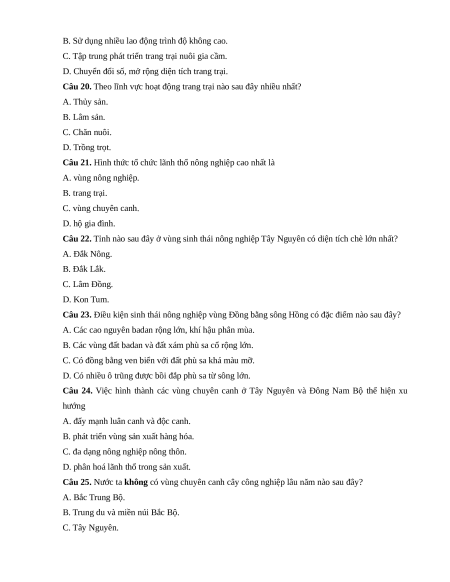 Câu 25. Nước ta không có vùng chuyên canh cây công nghiệp lâu năm nào sau đây? A. Bắc Trung Bộ.