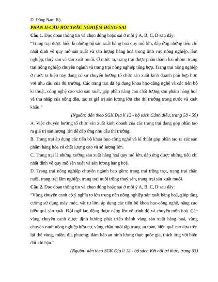 Trắc nghiệm Bài 13: Tổ chức lãnh thổ nông nghiệp Địa lí 12 Đúng-Sai, Trả lời ngắn sách mới 2025