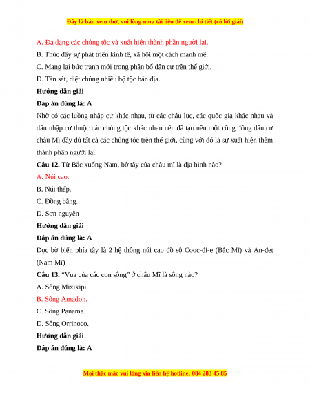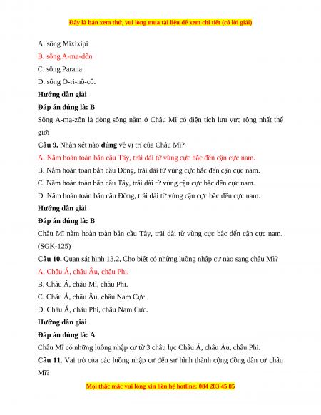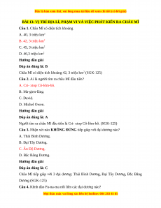 Câu 1. Châu Mĩ có diện tích khoảng A. 40, 3 triệu km2 B. 42, 3 triệu km2 C. 45, 3 triệu km2 D. 46,3 triệu km2 Hướng dẫn giải Đáp án đúng là: B