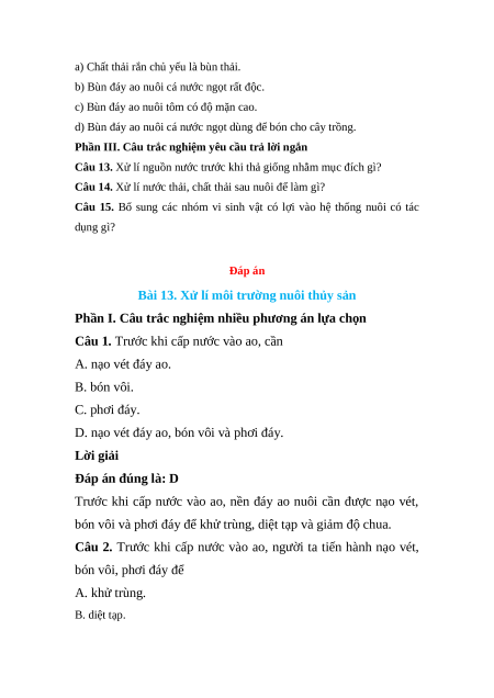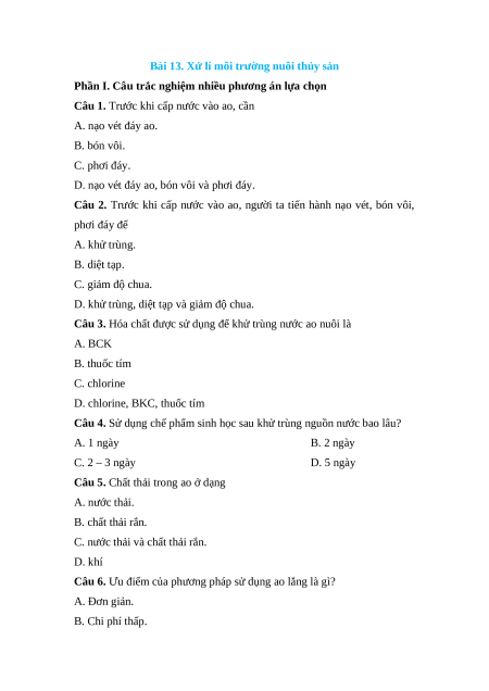 Câu 1. Trước khi cấp nước vào ao, cần A. nạo vét đáy ao. B. bón vôi. C. phơi đáy.