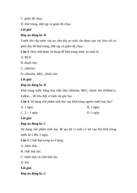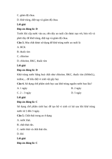 Câu 4. Sử dụng chế phẩm sinh học sau khử trùng nguồn nước bao lâu? A. 1 ngày B. 2 ngày C. 2 – 3 ngày D. 5 ngày Lời giải Đáp án đúng là: C