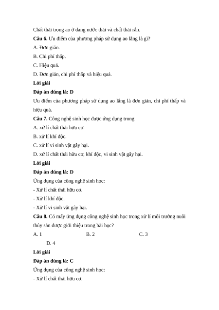 Câu 8. Có mấy ứng dụng công nghệ sinh học trong xử lí môi trường nuôi