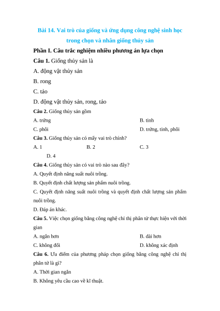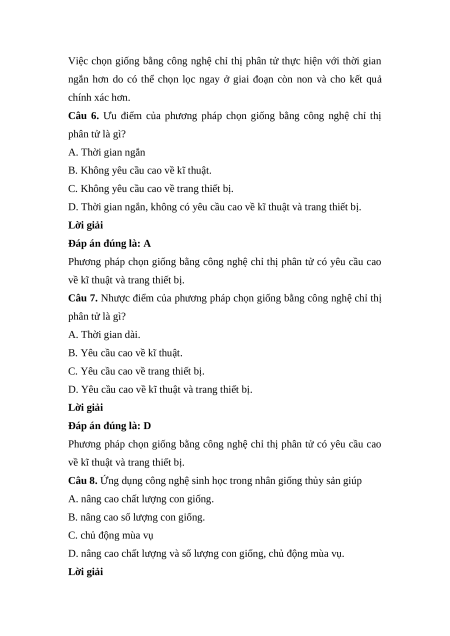 Câu 6. Ưu điểm của phương pháp chọn giống bằng công nghệ chỉ thị phân tử là gì? A. Thời gian ngắn