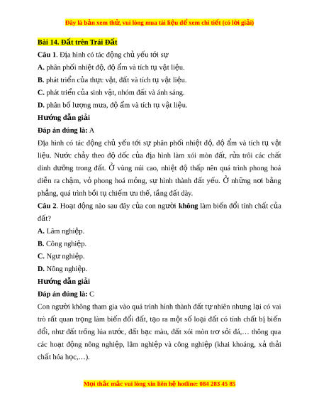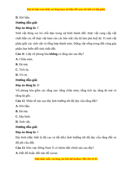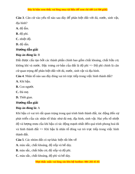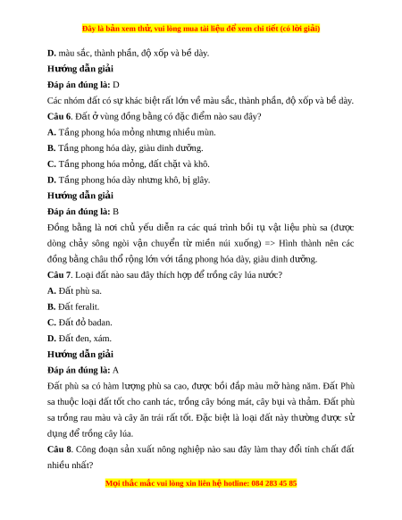 Đây là bản xem th , vu ử i lòng mua tài li u ệ đ xe ể m chi ti t (c ế ó l i ờ gi i ả ) D. màu s c, ắ thành ph n, đ ầ ộ x p và b ố ề dày. Hư ng d ớ ẫn gi i ả Đáp án đúng là: D Các nhóm đ t ấ có s khác ự bi t ệ r t ấ l n v ớ m ề àu s c, t ắ hành ph n, đ ầ x ộ p và b ố dày ề . Câu 6. Đất vùng đ ở ồng b ng có ằ đ c đi ặ m ể nào sau đây?