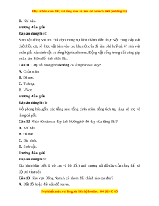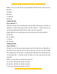 A. phân phối nhiệt đ , đ ộ ộ ẩm và tích t v ụ t ậ li u. ệ B. phát tri n c ể a ủ th c v ự t ậ , đ t ấ và tích tụ v t ậ li u. ệ C. phát tri n c ể a s ủ inh v t ậ , nhóm đ t ấ và ánh sáng. D. phân bố lư ng m ợ a, ư đ ộ m ẩ và tích t v ụ t ậ li u. ệ Hư ng d ớ ẫn gi i ả Đáp án đúng là: A Địa hình có tác đ ng ộ chủ y u ế t i ớ sự phân ph i ố nhi t ệ đ , ộ độ m ẩ và tích tụ v t ậ li u. ệ Nư c ớ ch y ả theo độ d c ố c a ủ đ a ị hình làm xói mòn đ t ấ , r a ử trôi các ch t ấ dinh dư ng ỡ trong đ t