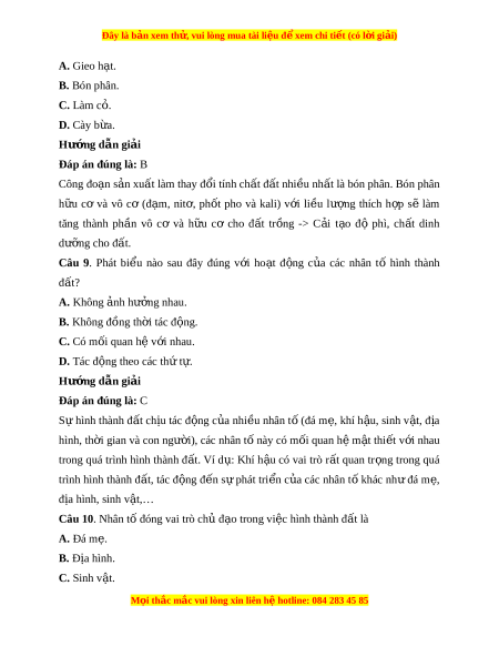 Đây là bản xem th , vu ử i lòng mua tài li u ệ đ xe ể m chi ti t (c ế ó l i ờ gi i ả ) A. Gieo h t ạ . B. Bón phân. C. Làm c . ỏ D. Cày b a. ừ Hư ng d ớ ẫn gi i ả Đáp án đúng là: B Công đo n ạ s n ả xu t ấ làm thay đ i ổ tính ch t ấ đ t ấ nhi u nh ề t ấ là bón phân. Bón phân h u ữ cơ và vô cơ (đ m ạ , nit , ơ ph t ố pho và kali) v i ớ li u ề lư ng ợ thích h p ợ sẽ làm tăng thành ph n ầ vô cơ và h u ữ cơ cho đ t ấ tr ng ồ -> C i ả t o ạ độ phì, ch t ấ dinh dư ng ỡ cho đ t ấ . Câu 9. Phát bi u ể nào sau đây đúng v i ớ ho t ạ đ ng ộ c a