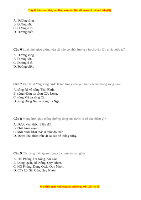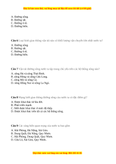 Câu 6 Loại hình giao thông vận tải nào có khối lượng vận chuyển lớn nhất nước ta? A. Đường sông. B. Đường sắt. C. Đường ô tô. D. Đường biển.