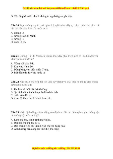 Câu 20 Trục đường xuyên quốc gia có ý nghĩa thúc đẩy sự phát triển kinh tế - xã