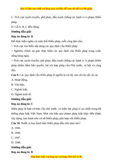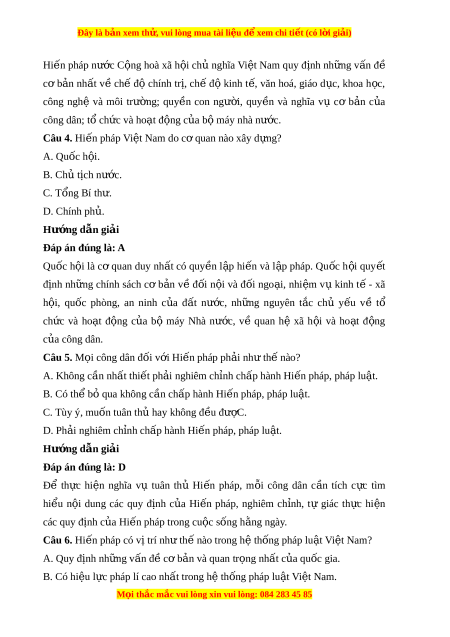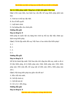 Đây là bản xem th , vu ử i lòng mua tài li u ệ đ xe ể m chi ti t ế (có l i ờ gi i ả ) Bài 14: Hi n pháp n ế ư c C ớ ng hoà xã h ộ i ộ ch nghĩ ủ a Vi t ệ Nam Câu 1. Khi so n ạ th o, ả ban hành hay s a ử đ i ổ , bổ sung Hi n ế pháp ph i ả tuân theo A. Trình tự và th t ủ c đ ụ c ặ biệt. B. Đa số bi u quy ể t ế . C. Lu t ậ hành chính. D. S h ự ư ng d ớ ẫn c a ủ chính ph . ủ Hư ng ớ d n gi ẫ i ả Đáp án đúng là: D Hi n ế pháp do Qu c ố h i ộ xây d ng ự theo trình t , ự thủ t c ụ đ c ặ bi t ệ , đư c ợ quy định trong Hi n pháp. ế Câu 2. T khi ừ l p ậ nư c đ ớ n ế nay Vi t ệ Nam có bao nhiêu b n ả Hi n pháp? ế A. 2. B. 3. C. 4. D. 5. Hư ng ớ d n gi ẫ i ả Đáp án đúng là: D Kể từ khi thành l p ậ nư c ớ Vi t ệ Nam dân ch ủ c ng ộ hòa đ n ế nay, nư c ớ ta đã có 05 b n ả Hi n ế pháp, đó là Hi n ế pháp năm 1946, Hi n ế pháp năm 1959, Hi n ế pháp năm 1992 (s a ử đ i ổ , bổ sung m t ộ số đi u ề năm 2001), Hi n ế pháp năm 2013. Câu 3. N i ộ dung hi n pháp bao g ế ồm v n đ ấ nào? ề A. B n ả ch t ấ nhà nư c. ớ B. Chế đ chí ộ nh tr . ị C. Chế đ ki ộ nh t . ế D. Cả A, B, C đ u đúng. ề Hư ng ớ d n gi ẫ i ả Đáp án đúng là: D M i