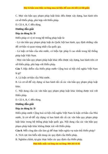 Đây là bản xem th , vu ử i lòng mua tài li u ệ đ xe ể m chi ti t ế (có l i ờ gi i ả ) C. M i ọ văn b n ả quy ph m ạ pháp lu t ậ khác đ u ề đư c ợ xây d ng, ự ban hành trên c s ơ ở Hi n pháp, phù h ế p ợ v i ớ Hi n pháp. ế D. Cả A, B, C đ u đúng. ề Hư ng ớ d n gi ẫ i ả Đáp án đúng là: D Hi n pháp có v ế ị trí trong h t ệ h ng pháp ố lu t ậ là: - Là văn b n ả quy ph m ạ pháp lu t ậ do Qu c ố h i ộ ban hành, quy đ nh ị nh ng ữ v n ấ đ c ề b ơ n ả và quan tr ng nh ọ ất c a qu ủ c gi ố a. - Là lu t ậ cơ b n ả c a ủ nhà nư c, ớ có hi u ệ l c ự pháp lí cao nh t ấ trong hệ th ng ố pháp lu t ậ Vi t ệ Nam. - M i ọ văn b n ả quy ph m ạ pháp lu t ậ khác đ u ề đư c ợ xây d ng, ự ban hành trên cơ sở Hi n pháp, phù h ế p v ợ i ớ Hi n pháp. ế Câu 7. Đ c ặ đi m ể c a ủ Hi n ế pháp nư c ớ C ng ộ hoà xã h i ộ chủ nghĩa Vi t ệ Nam là gì? A. Là lu t ậ c b ơ n ả c a N ủ hà nư c. ớ