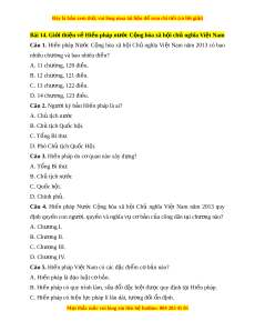 Đây là bản xem th , vu ử i lòng mua tài li u ệ đ xe ể m chi ti t (c ế ó l i ờ gi i ả ) Bài 14. Gi i ớ thi u v ệ H ề i n phá ế p nư c ớ C ng hòa xã h ộ i ộ ch ngh ủ ĩa Vi t ệ Nam Câu 1. Hi n ế pháp Nư c ớ C ng ộ hòa xã h i ộ Ch ủ nghĩa Vi t ệ Nam năm 2013 có bao nhiêu chư ng ơ và bao nhiêu đi u? ề A. 11 chư ng, ơ 120 đi u. ề B. 12 chư ng, 121 đi ơ u. ề C. 13 chư ng, 122 đi ơ u. ề D. 14 chư ng, ơ 123 đi u. ề Câu 2. Ngư i ờ ký b n H ả i n pháp ế là ai? A. Chủ tịch nư c ớ B. Ch t ủ ịch Quốc h i ộ . C. T ng B ổ í th . ư D. Phó Chủ tịch Qu c ố H i ộ . Câu 3. Hi n pháp ế do c quan nào xây ơ d ng? ự A. Tổng Bí th . ư B. Ch t ủ ịch nư c ớ C. Quốc h i ộ . D. Chính ph . ủ Câu 4. Hi n ế pháp Nư c ớ C ng ộ hòa xã h i ộ Chủ nghĩa Vi t ệ Nam năm 2013 quy định quy n con ng ề ư i ờ , quy n và nghĩ ề a v c ụ ơ b n c ả a ủ công dân t i ạ chư ng ơ nào? A. Chư ng I ơ . B. Chư ng ơ II. C. Chư ng ơ III. D. Chư ng I ơ V. Câu 5. Hi n pháp ế Vi t ệ Nam có các đ c ặ đi m ể c b ơ n ả nào? A. Hi n ế pháp là đ o l ạ u t ậ c b ơ n. ả B. Hi n pháp có quy t ế rình làm, s a đ ử i ổ đ c ặ bi t ệ đư c ợ quy đ nh t ị i ạ Hi n pháp. ế C. Hi n pháp có hi ế u l ệ c pháp l ự í lâu dài, tư ng ơ đ i ố n đ ổ nh. ị M i