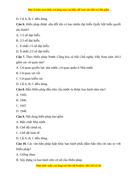 Đây là bản xem th , vu ử i lòng mua tài li u ệ đ xe ể m chi ti t (c ế ó l i ờ gi i ả ) D. C ả A, B, C đ u ề đúng. Câu 6. Hi n ế pháp đư c ợ s a ử đ i ổ khi có bao nhiêu đ i ạ bi u ể Qu c ố h i ộ bi u ể quy t ế tán thành? A. 1/3 số đ i ạ bi u. ể B. 2/3 số đ i ạ bi u. ể C. Ít nh t ấ 1/3 s đ ố i ạ bi u. ể D. Ít nh t ấ 2/3 số đ i ạ bi u. ể Câu 7. Theo Hi n ế pháp Nư c ớ C ng ộ hòa xã h i ộ Chủ nghĩa Vi t ệ Nam năm 2013 gồm các cơ quan nào? A. C quan quy ơ n l ề c ự nhà nư c, c ớ ơ quan qu n l ả í Nhà nư c ớ B. C quan ơ xét x . ử C. C quan ơ ki m ể sát. D. C ả A, B, C đ u ề đúng. Câu 8. B n H ả i n pháp ế đ u t ầ iên c a ủ nư c t