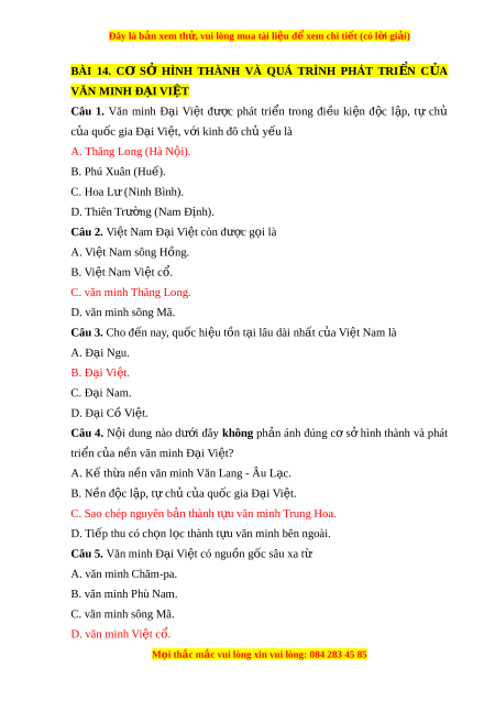 BÀI 14. CƠ SỞ HÌNH THÀNH VÀ QUÁ TRÌNH PHÁT TRI N Ể C A Ủ VĂN MINH ĐẠI VIỆT Câu 1. Văn minh Đ i ạ Vi t ệ đư c ợ phát tri n ể trong đi u ề ki n ệ đ c ộ l p, ậ tự chủ c a qu ủ ốc gia Đ i ạ Vi t ệ , v i ớ kinh đô ch y ủ u l ế à A. Thăng Long (Hà N i ộ ). B. Phú Xuân (Hu ) ế . C. Hoa L ( ư Ninh Bình). D. Thiên Trư ng ( ờ Nam Đ nh ị ). Câu 2. Việt Nam Đ i ạ Vi t ệ còn đư c g ợ i ọ là A. Việt Nam sông Hồng. B. Việt Nam Vi t ệ c . ổ C. văn minh Thăng Long. D. văn minh sông Mã. Câu 3. Cho đ n nay ế , quốc hi u t ệ ồn t i ạ lâu dài nh t ấ c a ủ Vi t ệ Nam là A. Đ i ạ Ngu. B. Đ i ạ Vi t ệ . C. Đ i ạ Nam. D. Đ i ạ Cồ Vi t ệ . Câu 4. N i ộ dung nào dư i ớ đây không ph n