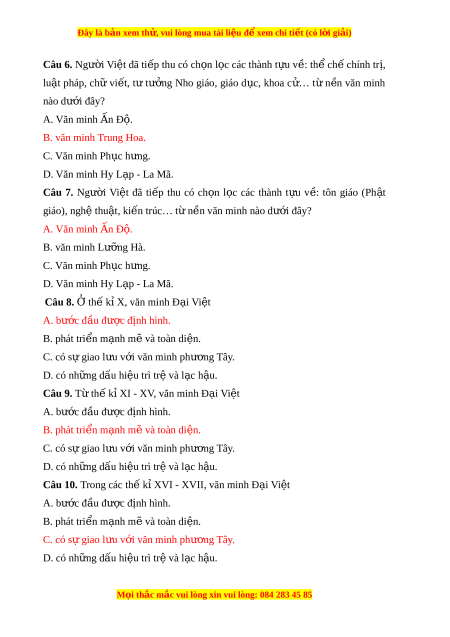 Đây là bản xem th , vu ử i lòng mua tài li u ệ đ xe ể m chi ti t (c ế ó l i ờ gi i ả ) Câu 6. Ngư i ờ Vi t ệ đã ti p ế thu có ch n ọ l c ọ các thành t u ự v : ề th ch ể ế chính tr ,ị lu t ậ pháp, chữ vi t ế , tư tư ng ở Nho giáo, giáo d c, ụ khoa c … ử t ừ n n ề văn minh nào dư i ớ đây? A. Văn minh n Đ Ấ . ộ B. văn minh Trung Hoa. C. Văn minh Ph c h ụ ng. ư D. Văn minh Hy L p - ạ La Mã. Câu 7. Ngư i ờ Vi t ệ đã ti p ế thu có ch n ọ l c ọ các thành t u ự v : ề tôn giáo (Ph t ậ giáo), ngh t ệ hu t ậ , ki n t ế rúc… t n ừ n văn m ề inh nào dư i ớ đây? A. Văn minh n Đ Ấ . ộ B. văn minh Lư ng ỡ Hà. C. Văn minh Ph c h ụ ng. ư D. Văn minh Hy L p - ạ La Mã. Câu 8. Ở th k ế ỉ X, văn minh Đ i ạ Vi t ệ A. bư c ớ đ u đ ầ ư c đ ợ nh hì ị nh. B. phát tri n m ể nh ạ m và t ẽ oàn di n. ệ C. có sự giao l u v ư i ớ văn minh phư ng ơ Tây. D. có nh ng d ữ u hi ấ u t ệ rì tr và l ệ c ạ h u. ậ Câu 9. T t ừ h k