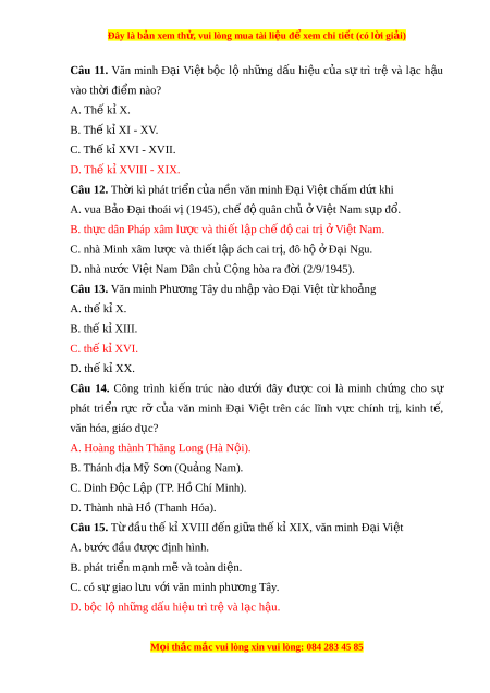 Đây là bản xem th , vu ử i lòng mua tài li u ệ đ xe ể m chi ti t ế (có l i ờ gi i ả ) Câu 11. Văn minh Đ i ạ Vi t ệ b c ộ lộ nh ng ữ d u ấ hi u ệ c a ủ sự trì trệ và l c ạ h u ậ vào th i ờ đi m ể nào? A. Th k ế X ỉ . B. Th k ế ỉ XI - XV. C. Th k ế ỉ XVI - XVII. D. Th k ế X ỉ VIII - XIX. Câu 12. Th i ờ kì phát tri n c ể a ủ n n văn m ề inh Đ i ạ Vi t ệ ch m ấ d t ứ khi A. vua B o ả Đ i ạ thoái v ( ị 1945), chế đ quân ch ộ ủ ở Vi t ệ Nam s p đ ụ . ổ B. th c dân ự Pháp xâm lư c và t ợ hi t ế l p ậ ch đ ế cai ộ tr ị ở Vi t ệ Nam. C. nhà Minh xâm lư c và ợ thi t ế l p ậ ách cai tr , đô h ị ộ Đ ở i ạ Ngu. D. nhà nư c ớ Vi t ệ Nam Dân ch C ủ ng ộ hòa ra đ i ờ (2/9/1945).