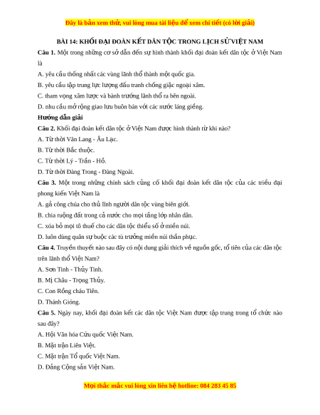 Đây là bản xem th , vu ử i lòng mua tài li u ệ đ xe ể m chi ti t (c ế ó l i ờ gi i ả ) BÀI 14: KHỐI Đ I Ạ ĐOÀN K T Ế DÂN T C Ộ TRONG L C Ị H S Ử VI T Ệ NAM Câu 1. M t ộ trong nh ng ữ cơ sở d n ẫ đ n ế sự hình thành kh i ố đ i ạ đoàn k t ế dân t c ộ ở Vi t ệ Nam là A. yêu cầu th ng