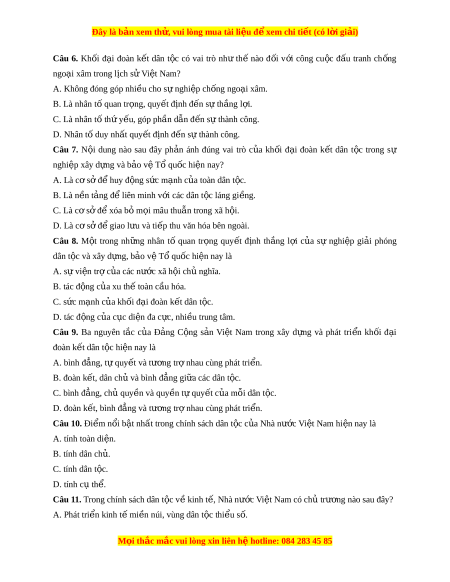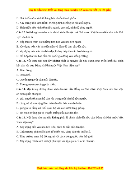Đây là bản xem th , vu ử i lòng mua tài li u ệ đ xe ể m chi ti t (c ế ó l i ờ gi i ả ) B. Phát tri n n ể n ki ề nh t hà ế ng hóa nhi u t ề hành ph n. ầ C. Xây d ng n ự n ki ề nh t t ế hị trư ng đ ờ nh ị hư ng xã ớ h i ộ chủ nghĩa. D. Phát tri n ể n n ki ề nh t nhi ế u ngà ề nh, quy mô, trình đ c ộ ông ngh . ệ Câu 12. N i ộ dung bao trùm c a ủ chính sách dân t c ộ mà Nhà nư c ớ Vi t ệ Nam tri n ể khai trên lĩnh v c ự văn hóa là A. ti p t ế hu có ch n ọ l c ọ nh ng