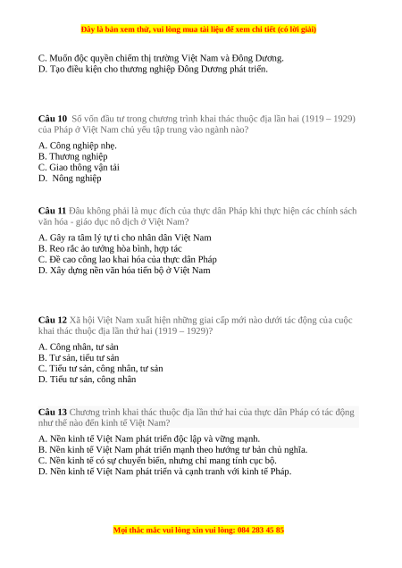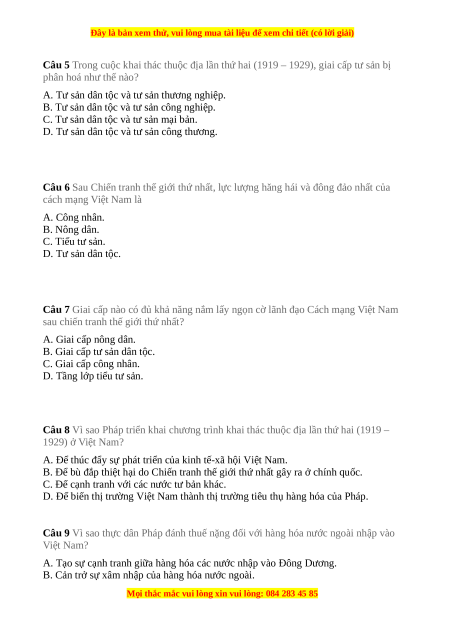 Câu 5 Trong cuộc khai thác thuộc địa lần thứ hai (1919 – 1929), giai cấp tư sản bị