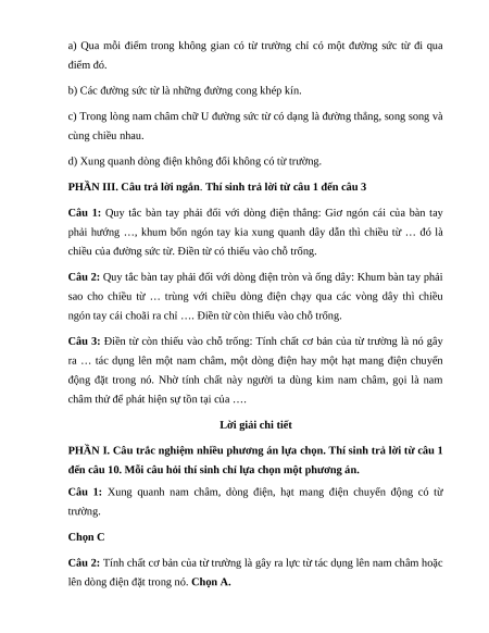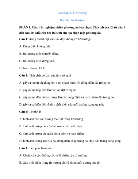 Câu 1: Xung quanh nam châm, dòng điện, hạt mang điện chuyển động có từ trường. Chọn C