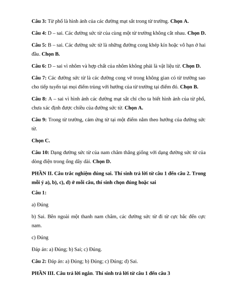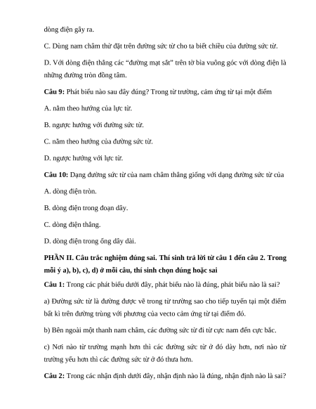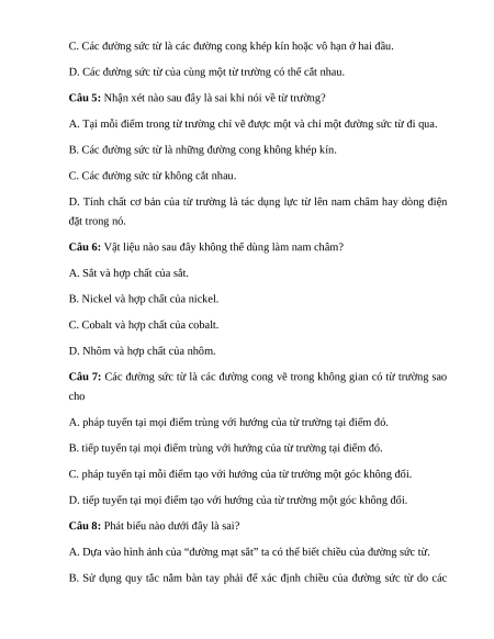 Câu 7: Các đường sức từ là các đường cong vẽ trong không gian có từ trường sao cho