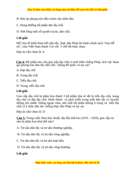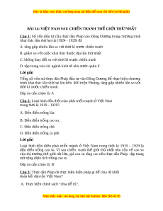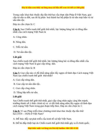 Đây là bản xem th , vu ử i lòng mua tài li u ệ đ xe ể m chi ti t (c ế ó l i ờ gi i ả ) Trong cuộc khai thác thu c ộ đ a ị l n t ầ h hai ứ c a ủ th c dân Pháp ự ở Vi t ệ Nam, giai cấp t s ư n ả ra đ i ờ , sau đó b phân hoá t ị hành hai b ph ộ n l ậ à tư s n ả m i ạ b n và ả tư s n ả dân t c. ộ Đáp án c n ch ầ n l ọ à: C Câu 6: Sau Chi n ế tranh thế gi i ớ th nh ứ t ấ , l c ự lư ng hăng hái ợ và đông đ o ả nh t ấ c a ủ cách m ng ạ Vi t ệ Nam là A. Công nhân. B. Nông dân. C. Ti u t ể s ư n. ả D. T s ư n dân t ả c. ộ L i ờ giải Sau chi n ế tranh th gi ế i ớ th nh ứ t ấ , l c l ự ư ng ợ hăng hái và đông đ o ả nh t ấ c a ủ cách m ng ạ Vi t