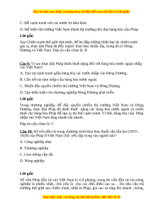 Câu 9: Vì sao th c dân Pháp đánh ự thuế n ng đ ặ i ố v i ớ hàng hóa nư c ớ ngoài nh p ậ vào Việt Nam? A. T o s ạ c ự nh ạ tranh gi a hàng hóa các ữ nư c nh ớ p ậ vào Đông Dư ng. ơ B. C n ả tr s ở xâm ự nh p ậ c a hàng hóa n ủ ước ngoài. C. Muốn đ c quy ộ n chi ề m ế th t ị rư ng ờ Vi t ệ Nam và Đông Dư ng. ơ D. T o đi ạ u ki ề ện cho thư ng ơ nghi p Đ ệ ông Dư ng phát ơ tri n. ể L i ờ giải Trong thư ng ơ nghi p, ệ để đ c ộ quy n ề chi m ế thị trư ng ờ Vi t ệ Nam và Đông Dư ng, ơ th c