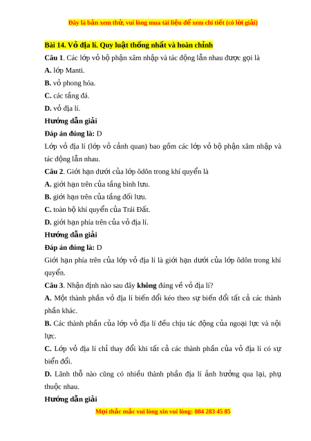 Đây là bản xem th , vu ử i lòng mua tài li u ệ đ xe ể m chi ti t ế (có l i ờ gi i ả ) Bài 14. V đ ỏ a l ị í. Quy lu t ậ th ng nh ố t ấ và hoàn ch nh ỉ Câu 1. Các l p v ớ b ỏ ph ộ n ậ xâm nh p và t ậ ác đ ng l ộ n nhau đ ẫ ư c g ợ i ọ là A. l p M ớ anti. B. vỏ phong hóa. C. các tầng đá. D. v đ ỏ ịa lí. Hư ng ớ d n gi ẫ i ả Đáp án đúng là: D L p ớ vỏ đ a ị lí (l p ớ vỏ c nh ả quan) bao g m ồ các l p ớ vỏ bộ ph n ậ xâm nh p ậ và tác đ ng l ộ ẫn nhau. Câu 2. Gi i ớ h n d ạ ư i ớ c a l ủ p ôdôn t ớ rong khí quy n l ể à A. gi i ớ h n t ạ rên c a ủ t ng bì ầ nh l u. ư B. gi i ớ h n ạ trên c a t ủ ng đ ầ i ố l u. ư C. toàn b khí ộ quy n c ể a ủ Trái Đ t ấ . D. gi i ớ h n phí ạ a trên c a ủ v đ ỏ a l ị í. Hư ng ớ d n gi ẫ i ả Đáp án đúng là: D Gi i ớ h n ạ phía trên c a ủ l p ớ vỏ đ a ị lí là gi i ớ h n ạ dư i ớ c a ủ l p ớ ôdôn trong khí quy n. ể Câu 3. Nh n đ ậ