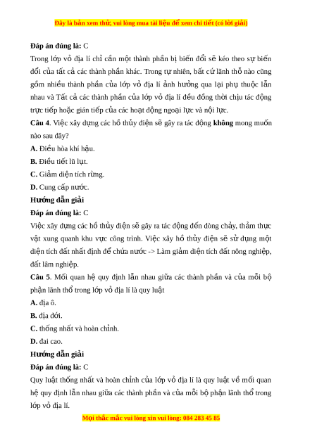 Đây là bản xem th , vu ử i lòng mua tài li u ệ đ xe ể m chi ti t (c ế ó l i ờ gi i ả ) Đáp án đúng là: C Trong l p ớ vỏ đ a ị lí chỉ c n ầ m t ộ thành ph n ầ bị bi n ế đ i ổ sẽ kéo theo sự bi n ế đổi c a ủ t t ấ cả các thành ph n ầ khác. Trong t ự nhiên, b t ấ c ứ lãnh th ỗ nào cũng gồm nhi u ề thành ph n ầ c a ủ l p ớ vỏ đ a ị lí nh ả hư ng ở qua l i ạ phụ thu c ộ l n ẫ nhau và T t ấ cả các thành ph n ầ c a ủ l p ớ vỏ đ a ị lí đ u ề đ ng ồ th i ờ ch u ị tác đ ng ộ tr c t ự i p ho ế c ặ gián ti p c ế a các ủ ho t ạ đ ng ộ ngo i ạ l c và n ự i ộ l c. ự Câu 4. Vi c ệ xây d ng ự các h ồ th y ủ đi n ệ s ẽ gây ra tác đ ng ộ không mong mu n ố nào sau đây? A. Đi u hòa ề khí h u. ậ B. Đi u t ề i t ế lũ l t ụ . C. Gi m ả di n t ệ ích r ng. ừ D. Cung c p n ấ ư c. ớ Hư ng d ớ ẫn gi i ả Đáp án đúng là: C Việc xây d ng ự các hồ th y ủ đi n ệ s ẽ gây ra tác đ ng ộ đ n ế dòng ch y ả , th m ả th c ự v t ậ xung quanh khu v c ự công trình. Vi c ệ xây hồ th y ủ đi n ệ sẽ sử d ng ụ m t ộ diện tích đ t ấ nh t ấ đ nh ị đ ch ể a ứ nư c ớ -> Làm gi m ả di n ệ tích đ t ấ nông nghi p, ệ đất lâm nghi p. ệ
