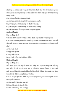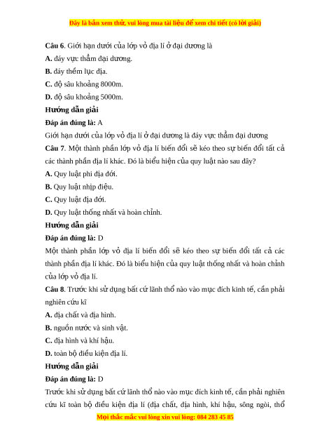 Đây là bản xem th , vu ử i lòng mua tài li u ệ đ xe ể m chi ti t ế (có l i ờ gi i ả ) Câu 6. Gi i ớ h n d ạ ư i ớ c a l ủ p v ớ ỏ đ a ị lí ở đ i ạ dư ng ơ là A. đáy v c t ự h m ẳ đ i ạ dư ng. ơ B. đáy th m ề l c ụ đ a. ị C. đ s ộ âu kho ng 8000m ả . D. đ s ộ âu kho ng 5000m ả . Hư ng ớ d n gi ẫ i ả Đáp án đúng là: A Gi i ớ h n d ạ ư i ớ c a l ủ p v ớ ỏ địa lí ở đ i ạ dư ng ơ là đáy v c t ự h m ẳ đ i ạ dư ng ơ Câu 7. M t ộ thành ph n ầ l p ớ vỏ đ a ị lí bi n ế đ i ổ sẽ kéo theo sự bi n ế đ i ổ t t ấ cả