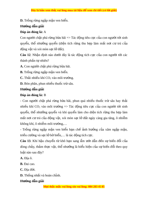 ự vì thế chúng không t n ồ t i ạ và phát tri n ể m t ộ cách cô l p. ậ Các thành ph n ầ c a ủ l p ớ vỏ đ a ị lí luôn xâm nh p ậ vào nhau, trao đổi v t ậ ch t ấ và năng lư ng v ợ i ớ nhau. Câu 11. Nh n ậ đ nh ị nào dư i ớ đây là tác đ ng ộ tiêu c c ự c a ủ con ngư i ờ t i ớ các thành phần t nhi ự ên? A. Con ngư i ờ ch t ặ r ng b ừ a ừ bãi. B. Bón phân h p ợ lí, cày x i ớ đ t ấ . C. Phát tri n nông - ể lâm k t ế h p. ợ M i ọ thắc m c