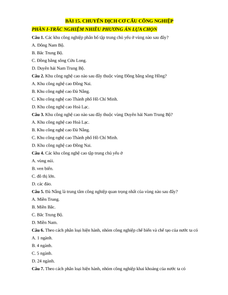 Câu 1. Các khu công nghiệp phân bố tập trung chủ yếu ở vùng nào sau đây? A. Đông Nam Bộ. B. Bắc Trung Bộ.