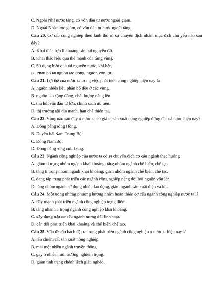 Câu 21. Lợi thế của nước ta trong việc phát triển công nghiệp hiện nay là