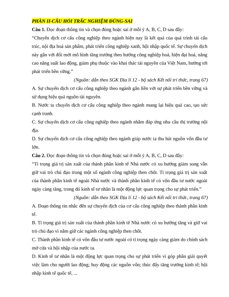 Trắc nghiệm Bài 15: Chuyển dịch cơ cấu ngành công nghiệp Địa lí 12 Đúng-Sai, Trả lời ngắn sách mới 2025
