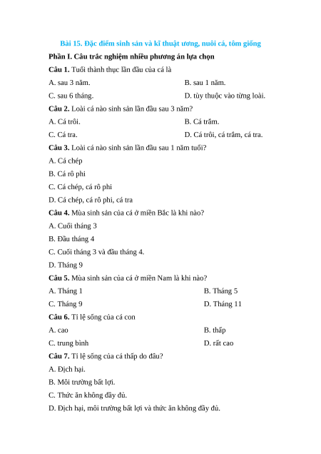 Câu 1. Tuổi thành thục lần đầu của cá là A. sau 3 năm. B. sau 1 năm. C. sau 6 tháng.