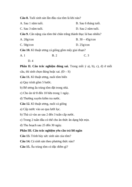 Câu 8. Tuổi sinh sản lần đầu của tôm là khi nào? A. Sau 1 năm tuổi. B. Sau 6 tháng tuổi. C. Sau 3 năm tuổi. D. Sau 2 năm tuổi.