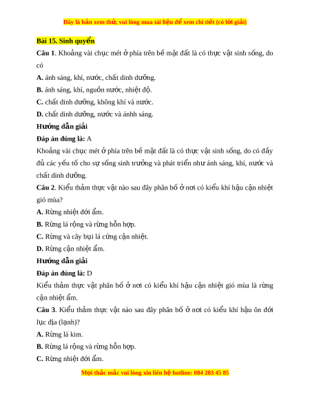 Đây là bản xem th , vu ử i lòng mua tài li u ệ đ xe ể m chi ti t (c ế ó l i ờ gi i ả ) Bài 15. Sinh quy n ể Câu 1. Kho ng ả vài ch c ụ mét ở phía trên b ề m t ặ đ t ấ là có th c ự v t ậ sinh s ng, ố do có