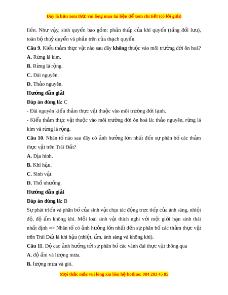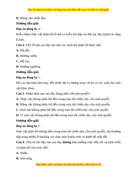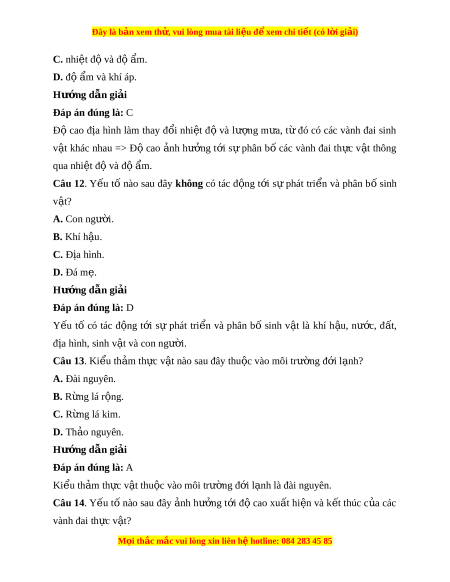 Đây là bản xem th , vu ử i lòng mua tài li u ệ đ xe ể m chi ti t (c ế ó l i ờ gi i ả ) D. R ng ừ c n ậ nhi t ệ m ẩ . Hư ng d ớ ẫn gi i ả Đáp án đúng là: A Ki u ể th m ả th c ự v t ậ phân bố ở n i ơ có ki u ể khí h u ậ ôn đ i ớ l c ụ đ a ị (l nh) ạ là r ng ừ lá kim. Câu 4. Y u t