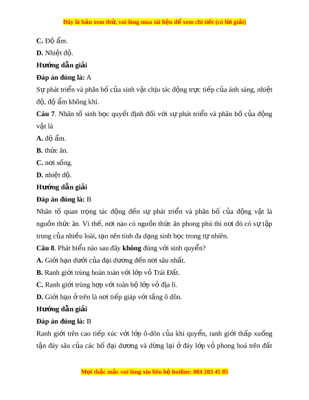 Đây là bản xem th , vu ử i lòng mua tài li u ệ đ xe ể m chi ti t (c ế ó l i ờ gi i ả ) C. Độ m ẩ . D. Nhi t ệ đ . ộ Hư ng d ớ ẫn gi i ả Đáp án đúng là: A S ự phát tri n và ể phân b ố c a ủ sinh v t ậ ch u t ị ác đ ng ộ tr c ự ti p ế c a ủ ánh sáng, nhi t ệ đ , ộ đ ộ m ẩ không khí.