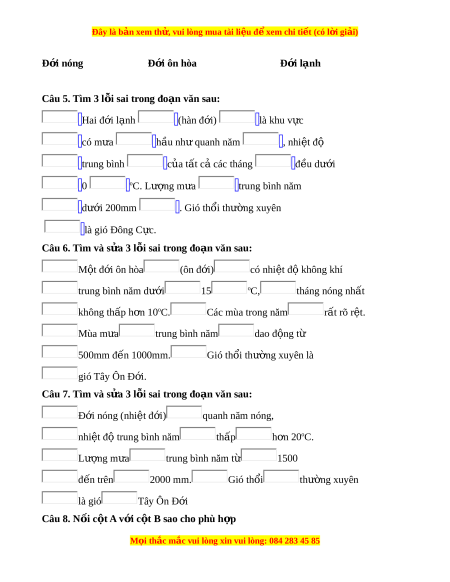 ỗ sai trong đo n văn s ạ au: Đ i ớ nóng (nhi t ệ đ i ớ ) quanh năm nóng, nhi t ệ độ trung bình năm thấp h n 20 ơ oC. Lư ng ợ m a ư trung bình năm từ 1500 đ n t ế rên 2000 mm. Gió thổi thư ng xuyên ờ là gió Tây Ôn Đ i ớ Câu 8. N i ố c t ộ A v i ớ c t ộ B sao cho phù h p ợ M i ọ thắc m c