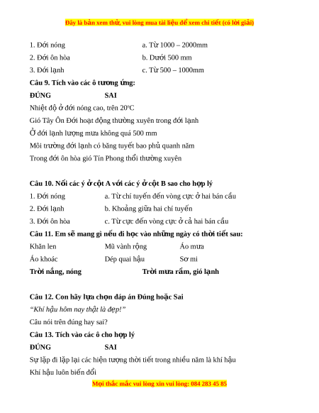 ớ ôn hòa gió Tín Phong th i ổ thư ng xuyên ờ Câu 10. N i ố các ý c ở t ộ A v i ớ các ý c ở t ộ B sao cho h p l ợ ý 1. Đ i ớ nóng a. T chí ừ tuy n đ ế n vòng c ế c ự ở hai bán cầu 2. Đ i ớ l nh ạ b. Kho ng ả gi a hai ữ chí tuy n ế 3. Đ i ớ ôn hòa c. T c ừ c đ ự n vòng c ế c ự c ở ả hai bán cầu Câu 11. Em s m ẽ ang gì n u đi ế h c vào nh ọ ng n ữ gày có th i ờ ti t ế sau: Khăn len Mũ vành r ng ộ Áo m a ư Áo khoác Dép quai h u ậ S m ơ i Tr i ờ nắng, nóng Tr i ờ m a r ư ầm, gió l nh ạ
