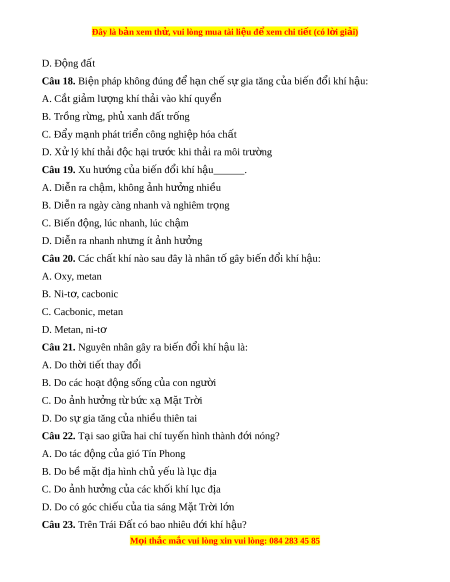 Câu 17. Thiên tai nào không ph i ả do bi n ế đ i ổ khí h u? ậ A. Bão B. Lũ l t ụ C. H n hán ạ M i ọ thắc m c