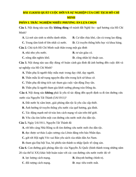 BÀI 15.KHÁI QUÁT CUỘC ĐỜI VÀ SỰ NGHIỆP CỦA CHỦ TỊCH HỒ CHÍ MINH