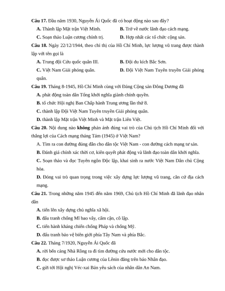 Câu 21. Trong những năm 1945 đến năm 1969, Chủ tịch Hồ Chí Minh đã lãnh đạo nhân dân