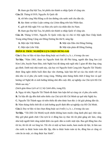 Trắc nghiệm Bài 15: Khái quát cuộc đời và sự nghiệp của Hồ Chí Minh Lịch sử 12 Đúng-Sai, Trả lời ngắn 2025