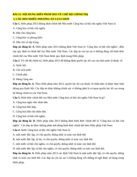 Câu 1. Hiến pháp 2013 khẳng định chính thể Nhà nước Cộng hòa xã hội chủ nghĩa Việt Nam là